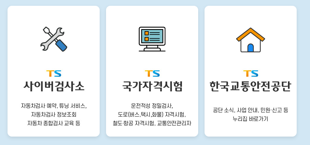 한국교통안전공단(TS) 공식 홈페이지는 교통 안전과 자동차 검사를 위한 종합 정보 제공 사이트입니다. 자동차 검사 예약 및 결과 조회, 중고차 이력 조회, 교통안전 교육 신청, 친환경 차량 지원 정책 등 다양한 서비스를 제공합니다. 또한 교통사고 예방 연구, 대중교통·철도·항공 안전 관리 등 국민의 교통안전을 위한 다양한 정책과 정보를 확인할 수 있습니다.