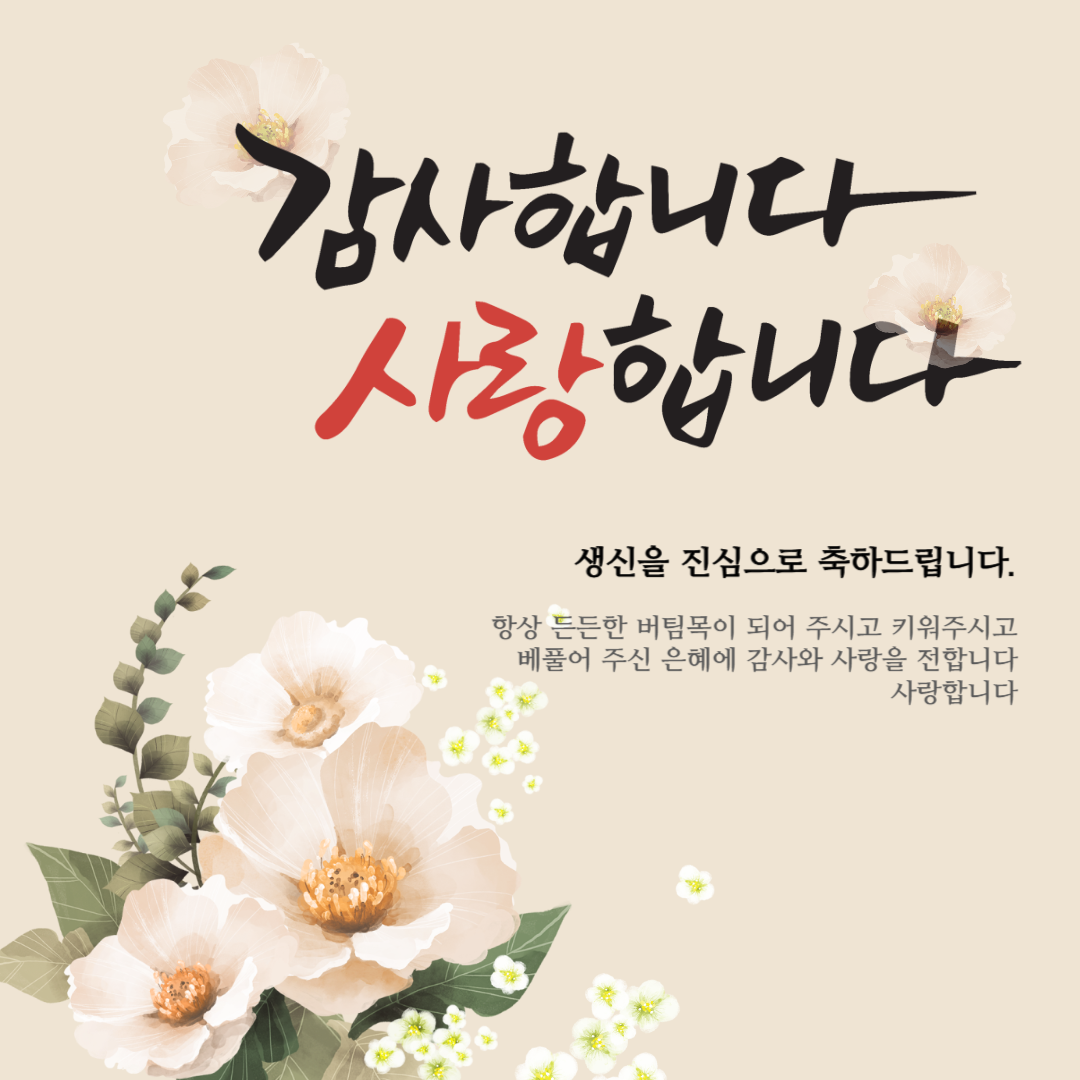 - "아버님, 태어나신 이 날이 있기에 저희 가족이 함께할 수 있어 정말 감사한 마음입니다. 건강과 행복이 늘 함께하시길 바라며, 생신을 진심으로 축하드립니다!"